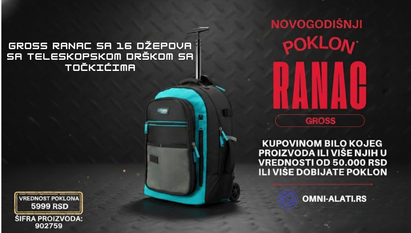 Prilikom kupovine bilo kojih proizvoda u ukupnoj vrednosti od 50.000 RSD ili više, na poklon dobijate ekskluzivni GROSS ranac, vredan 5.999 RSD – potpuno **gratis**!