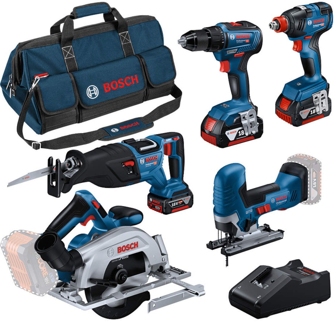 Profesionalni Bosch set koji objedinjuje pet snažnih akumulatorskih alata za kompletnu obradu drveta, metala i montažne radove. Kombinacija bušilice-odvrtača, ubodne testere, kružne testere, recipro testere i udarnog odvijača omogućava brzo i efikasno izvođenje širokog spektra poslova na terenu ili u radionici.