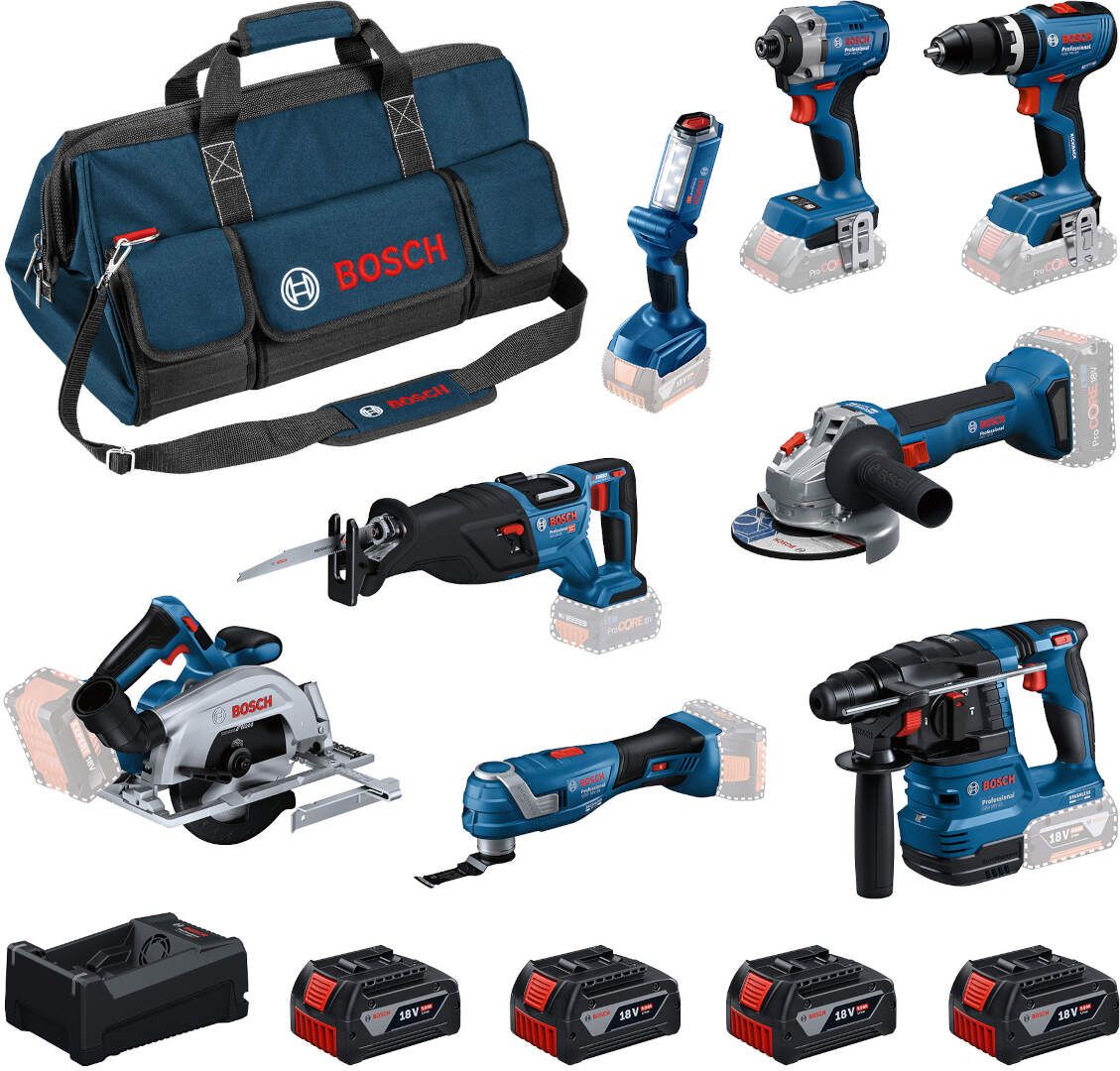 Bosch Professional set od 8 akumulatorskih alata je kompletno rešenje za profesionalce i majstore koji žele pouzdan, snažan i praktičan paket za rad na terenu i u radionici. U setu dobijate sve najčešće korišćene alate za bušenje, sečenje, brušenje, šrafljenje, renoviranje i osvetljenje radnog prostora, uz 4 baterije GBA 18V 5,0Ah, brzi punjač i torbu za alat.