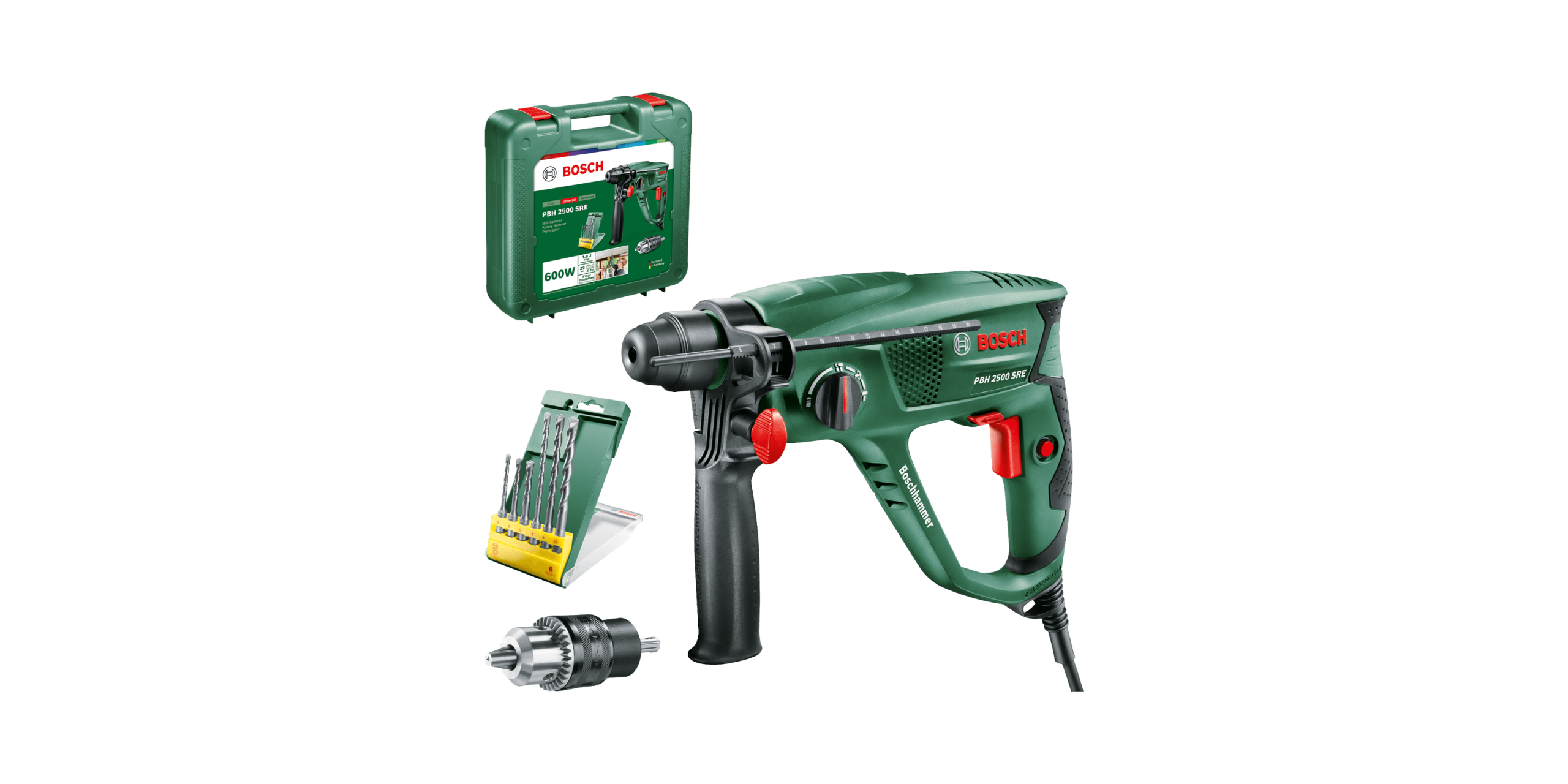 PBH 2500 SRE elektro-pneumatski čekić za bušenje sa kablom je savršen za teško bušenje, udarno bušenje i štemovanje u betonu, zidovima, pločicama, drvetu i metalu. Veliku udarnu snagu od 1,9 džula isporučuje njegov pneumatski Bosch vibracioni mehanizam, koji pokreće snažan motor od 600 W. Njegova SDS plus stezna glava omogućava zamenu dodatnog pribora bez alata i omogućava umetanje priložene adapterske stezne glave za korišćenje burgija sa okruglim prihvatom. Optimalni radni ugao obezbeđuje njegova Vario Lock funkcija štemovanja koja obezbeđuje 36 različitih pozicija dleta koje je moguće izabrati. Bosch elektronika sa regulisanjem broja obrtaja isporučuje tačnu brzinu za materijal preko okidača osetljivog na pritisak.