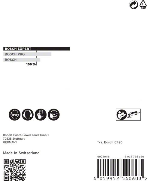 Do 4x bolje smanjenje količine prašine u odnosu na Bosch C420 brusni papirIzuzetno efikasno uklanjanje prašine uz Bosch Particle Control.Samo zakačite pomoću čičak trake.Idealna je za veoma delotvorno brušenje ravnih površina uz vrlo malo prašine, za brušenje i pripremu površina za farbanje i za pripremu ili završnu obradu gipsa.EXPERT abrazivi – najbolji za sve zanate.