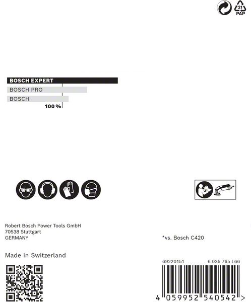 Do 4x bolje smanjenje količine prašine u odnosu na Bosch C420 brusni papirIzuzetno efikasno uklanjanje prašine uz Bosch Particle Control.Samo zakačite pomoću čičak trake.Idealna je za veoma delotvorno brušenje ravnih površina uz vrlo malo prašine, za brušenje i pripremu površina za farbanje i za pripremu ili završnu obradu gipsa.EXPERT abrazivi – najbolji za sve zanate.