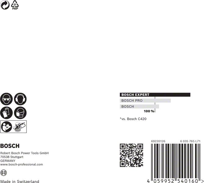 Do 4x bolje smanjenje količine prašine u odnosu na Bosch C420 brusni papirIzuzetno efikasno uklanjanje prašine uz Bosch Particle Control.Samo zakačite pomoću čičak trake.Idealna je za veoma delotvorno brušenje ravnih površina uz vrlo malo prašine, za brušenje i pripremu površina za farbanje i za pripremu ili završnu obradu gipsa.EXPERT abrazivi – najbolji za sve zanate.