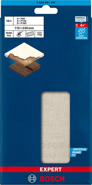 Do 4x bolje smanjenje količine prašine u odnosu na Bosch C420 brusni papir – Prašina predstavlja veliki problem kod brušenja. Lepi se za brusni papir, pa on postaje beskoristan. Prekriva sve što je u sobi i prodire kroz celu kuću. Zato smo smislili tehnologiju Bosch Particle Control i unapredili smanjenje prašine na novi nivo. Bosch Particle Control osigurava da usisivač ili filter uvuku sve čestice prašine. Najvažniji deo ovog sistema je Bosch EXPERT M480 brusna mreža: Čestice se kreću pravo kroz njegovu otvorenu mrežu umesto da začepe površinu ili zagađuju vazduh. To ga takođe čini veoma efikasnim i izuzetno dugotrajnim. Smanjenje prašine prilikom brušenja nije lako, ali smo pronašli rešenje. Ova Bosch EXPERT M480 brusna mreža koristi našu tehnologiju Particle Control da bi nivo prašine sveo na najmanju meru. Samo zakačite pomoću čičak trake.