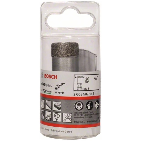 Dug radni vek za keramiku – Dijamantski sekač Dry Speed je dugotrajan kod suvog bušenja tvrde keramike. Njegovi prvoklasni dijamanti daju veoma velike brzine bušenja, a tehnologija vakuumskog lemljenja osigurava dug radni vek. Ovaj proizvod je namenjen za pločice od mekanih zidnih pločica do veoma tvrdih podnih pločica, poput finih kamenih. Pogodno je za upotrebu sa ugaonim brusilicama. Sa otvorom od 22,23 mm za ugaone brusilice sa standardnom sigurnosnom maticom.