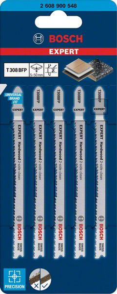 Veoma čista završna obrada gore i dole – Za tesare i stolare oduvek je bila umetnost da se postaraju da se čista strana ubodnog reza nađe na vidljivom delu radne površine. Ponekad možete da okrenete radnu površinu, a ponekad sama ubodna testera može da se drži naopako. A možete i da koristite EXPERT „Hardwood 2-side clean“, koji nudi savršen rez bez cepanja sa obe strane zahvaljujući svojim kontra-usmerenim zupcima. Genijalni dizajn ovih listova ubodne testere znači da nije potreban dalji rad nakon sečenja – zupci izbegavaju cepanje na potezima nagore i nadole. Ovo je savršeno za profesionalce koji žele da uštede vreme, a da svojim klijentima obezbede najkvalitetniji rad. Napravljen od Bi-Metala – trake čelika za velike brzine zalepljenog za fleksibilni čelični list testere kako bi se kombinovala snaga i fleksibilnost – Bosch EXPERT „Hardwood 2-side clean“ list ubodne testere je dovoljno robustan da iseče kuhinjske ploče od laminirane iverice ili tvrdo drvo. Dostupan je za uzastopne rezove bez cepanja (T308BF) i za posebno precizne rezove bez cepanja pod uglom (T308BFP) Odgovara za sve ubodne testere sa T držačem.