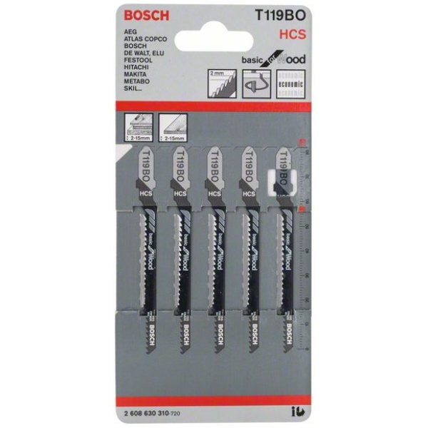 Krivolinijsko sečenje mekog drveta – T 119 BO Basic for Wood list ubodne testere pravi krivolinijske rezove u drvetu. Njegovi glodani, talasasti zupci su idealni za rezove bez posebnih uslova. Sem toga, njegov uzani list testere je optimizovan za krivolinijske rezove. Materijal lista testere od visokouglj. čelika je pogodan za meko drvo i neabrazivne materijale za rad u drvetu. Fino rastojanje zubaca (2 mm) lista testere omogućava sečenje tankih drvenih materijala debljine 2 – 15 mm. Za upotrebu sa ubodnim testerama sa sistemima pričvršćivanja sa T-prihvatom. Odgovara za sve ubodne testere sa T držačem.