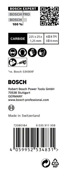 Traje do 50x duže od Bosch S3456XF noža u tvrdim materijalima – Mnogi listovi testere koji se reklamiraju kao da su za razne materijale su dobri za drvo i meki metal, ali ne mogu da seku tvrđe elemente poput vijaka ili metalnih okova. EXPERT „Multi Material“ nema takvih problema: njegovi karbidni zupci mogu da preseku najtvrđi čelik – iznova i iznova. Pravo rešenje problema listova testere koji jednostavno ne traju na savremenom gradilištu, Bosch EXPERT „Multi Material“ list univerzalne testere je pouzdan partner koji seče više od metala i drveta. Plastika, građevinski kompoziti i prefabrikovani elementi koji se koriste na gradilištima pouzdano se seku zahvaljujući Bosch Carbide Technology. Progresivno rastojanje zubaca je dizajnirano da seče tanke i debele materijale. Budući da Bosch EXPERT „Multi Material“ list univerzalne testere traje mnogo duže i radi na svakom materijalu, od velike je vrednosti za profesionalce, koji dobijaju na produktivnosti, a štede na sečivima. Odgovara za sve univerzalne testere sa S držačem.