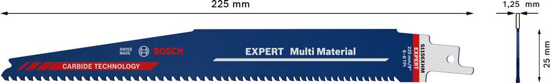 Traje do 50x duže od Bosch S3456XF noža u tvrdim materijalima – Mnogi listovi testere koji se reklamiraju kao da su za razne materijale su dobri za drvo i meki metal, ali ne mogu da seku tvrđe elemente poput vijaka ili metalnih okova. EXPERT „Multi Material“ nema takvih problema: njegovi karbidni zupci mogu da preseku najtvrđi čelik – iznova i iznova. Pravo rešenje problema listova testere koji jednostavno ne traju na savremenom gradilištu, Bosch EXPERT „Multi Material“ list univerzalne testere je pouzdan partner koji seče više od metala i drveta. Plastika, građevinski kompoziti i prefabrikovani elementi koji se koriste na gradilištima pouzdano se seku zahvaljujući Bosch Carbide Technology. Progresivno rastojanje zubaca je dizajnirano da seče tanke i debele materijale. Budući da Bosch EXPERT „Multi Material“ list univerzalne testere traje mnogo duže i radi na svakom materijalu, od velike je vrednosti za profesionalce, koji dobijaju na produktivnosti, a štede na sečivima. Odgovara za sve univerzalne testere sa S držačem.