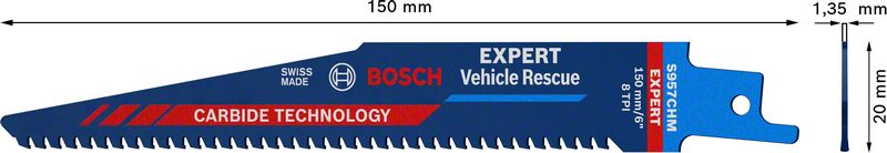 Traje do 50x duže od Bosch S1122BF noža u tvrdim materijalima – U spasavanju iz vozila, brz ulazak u automobil može biti pitanje života i smrti. Hitne službe sve više koriste univerzalne testere kao dragoceno sredstvo za spasavanje, ali potreban im je ozbiljno dobar list testere koji pouzdano može da preseče moderni automobilski čelik. EXPERT „Vehicle Rescue“ je dizajniran za ovaj ključni zadatak. Ovaj EXPERT za sečenje vozila ima veoma tvrdi karbid u zupcima i poseban dizajn vrha koji omogućava listu testere da uroni u lim i iseče ga. Ovo se koristi u tipičnim metodama spasavanja kao što je prosecanje dodatnih vrata ili pristup putnicima kroz krov. Kratka S957CHM verzija je idealna za uklanjanje vetrobranskih stakala, dok je duži S1157CHM dizajniran za sečenje A, B i C stubova napravljenih od ojačanog čelika. Napravljen uz Bosch Carbide Technology, Bosch EXPERT „Vehicle Rescue“ list univerzalne testere seče savremena vozila brzo i pouzdano – i pomaže vam da spasite živote. Odgovara za sve univerzalne testere sa S držačem.