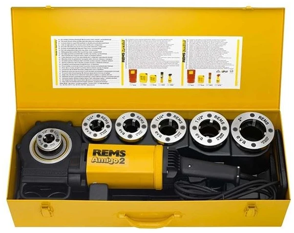 Amigo 2 komplet Električni rezač navoja sa brzozamenljivm reznim glavama. Za navoje cevi ⅛ – 2”, 16 – 50 mm, navoje sprežnjaka 6 – 30 mm, ¼ – 1”. Za desne i leve navoje
